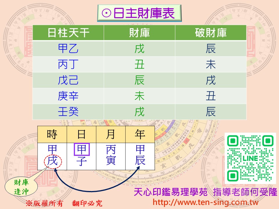 甲、乙日主 → 財庫在『戌』,逢辰來沖 丙、丁日主 → 財庫在『丑』,逢未來沖 戊、己日主 → 財庫在『辰』,逢戌來沖 庚、辛日主 → 財庫在『未』,逢丑來沖 壬、癸日主 → 財庫在『戌』,逢辰來沖